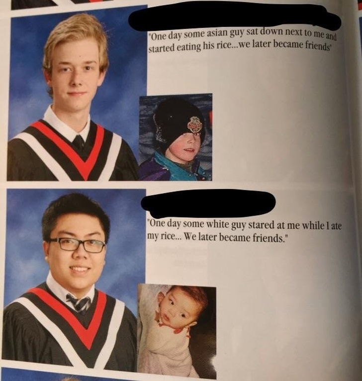“Un día, un chico asiático se sentó a mi lado y comenzó a comer arroz… y luego nos hicimos amigos”.
