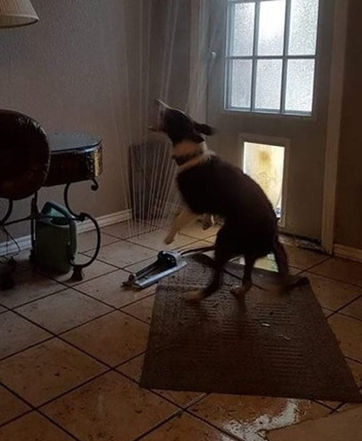 Este perro puede recibir el título del “Mejor amigo de todos”. Arrastró el rociador a través de la entrada para perros para traer un poco de frescura a la casa