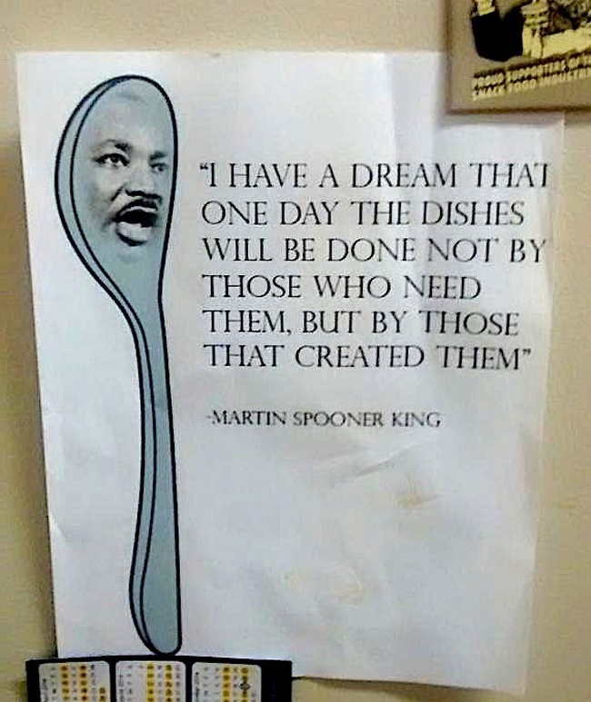“Tengo el sueño de que algún día los platos no serán lavados por aquel que necesite usarlos, sino por aquel que los dejó sucios. Martin Cucharín King”.