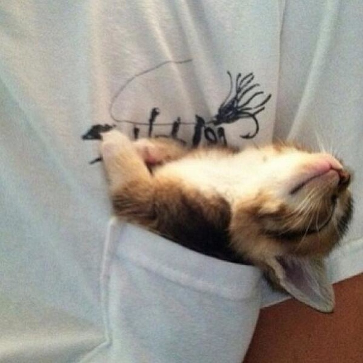 1. “Su nombre es Audrey. Es la gatita más pequeña que he visto en mi vida, y se quedó dormida en el bolsillo de mi compañera de cuarto de esta manera”