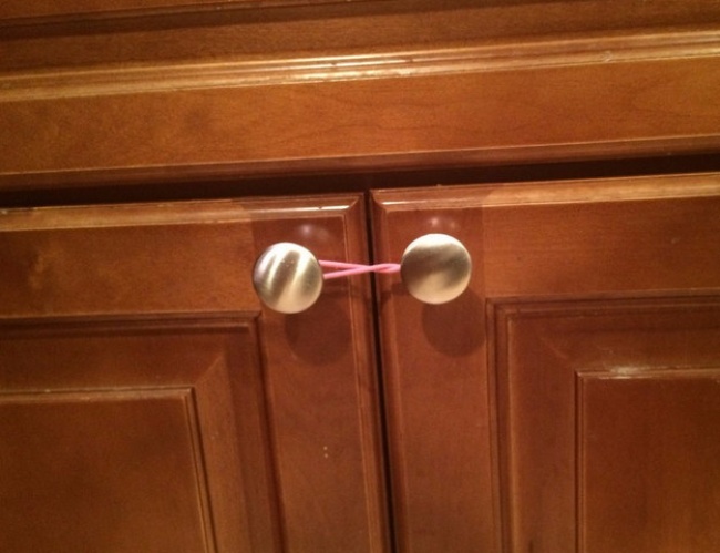 To prevent your little ones from opening cupboards with dangerous things inside, use a hair tie.
