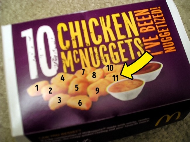 Posiblemente tu nunca te hayas puesto a contar los pedacitos de pollo representados en la caja de tus nuggets favoritos. Pero nosotros dedicamos un tiempo a esto y no fue en balde: se esconde entre las salsas un undécimo pedacito. Esto es curioso, ya que adentro no se encuentra.