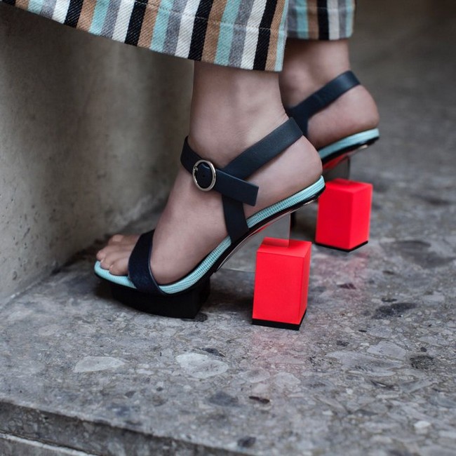 A ideia do sapato é exatamente provocar uma ilusão de ótica e parecer que ele está flutuando sobre o cubo.