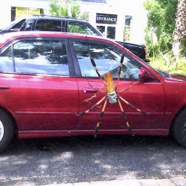 Na verdade, a aranha está em primeiro plano e o carro, ao fundo.