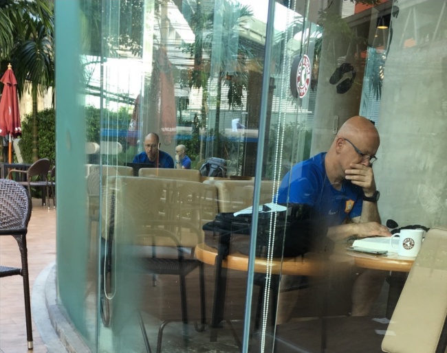 Tres clientes idénticos en una cafetería