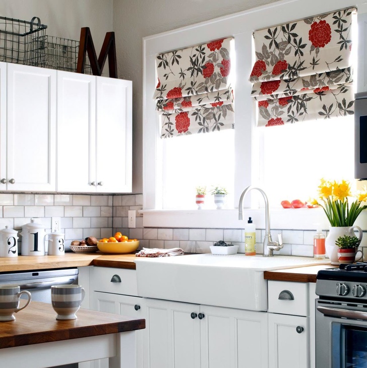 Una combinación de rojo y blanco con un estampado floral en las cortinas es un clásico que, sin embargo, puede agregar colores a tu cocina.
