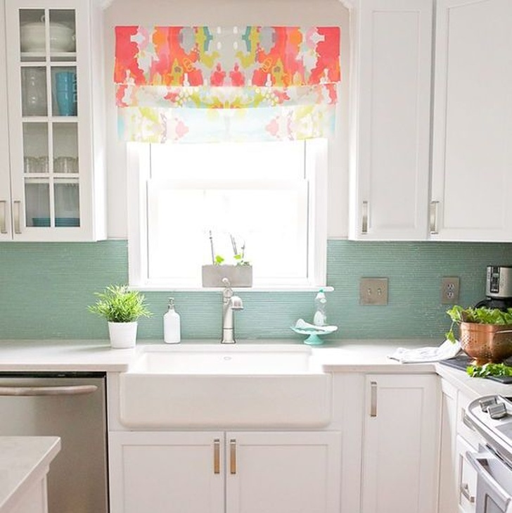 Las cortinas con un patrón de “acuarela” se combinan armoniosamente con un suave tono turquesa claro de azulejos de cocina.