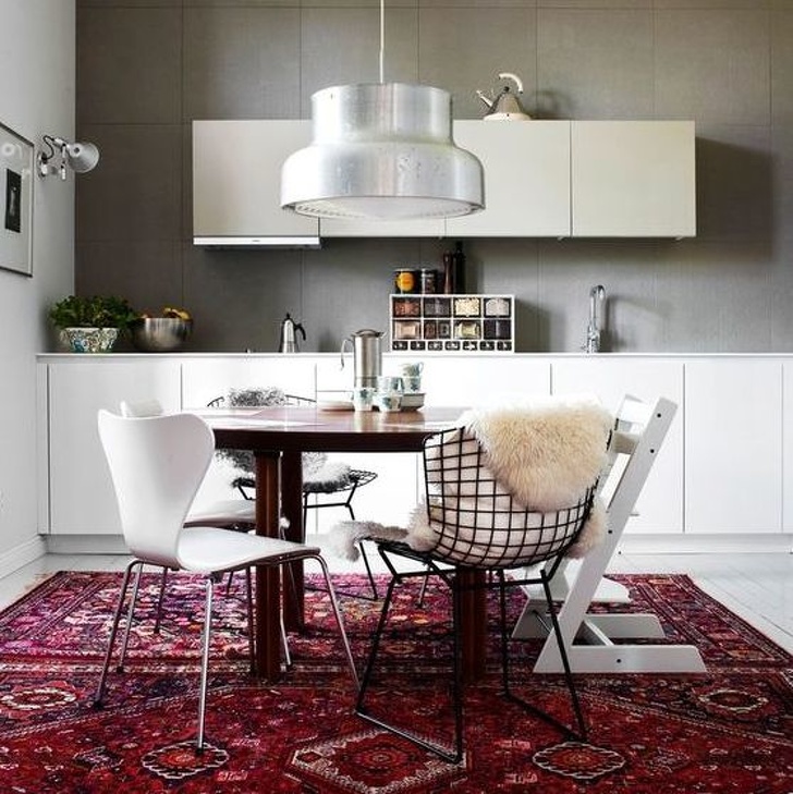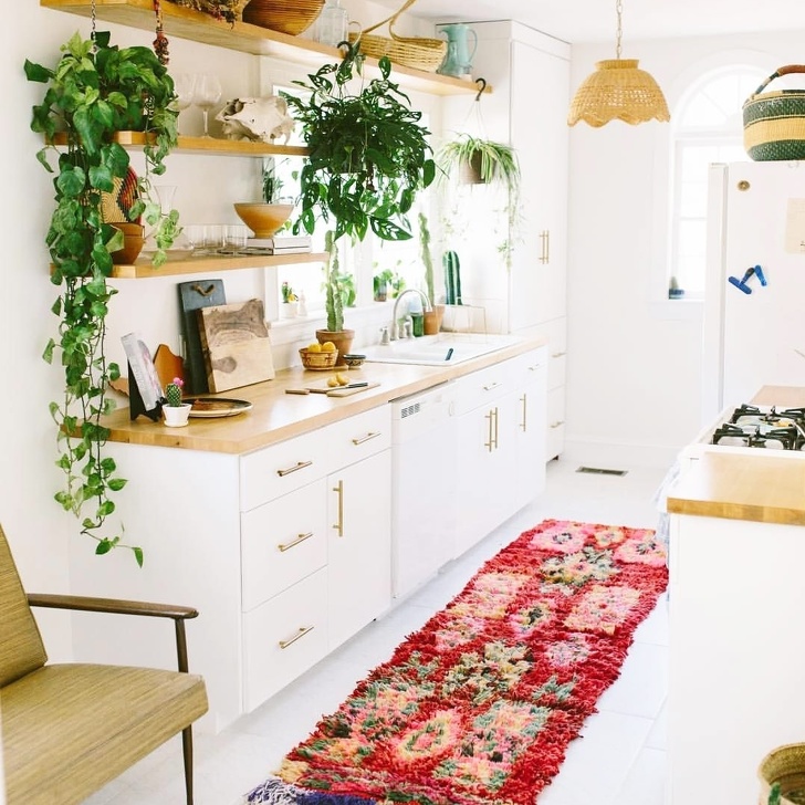 Una alfombra colorida de pelo largo crea comodidad en el interior blanco de la cocina. Te hace querer pisarla.