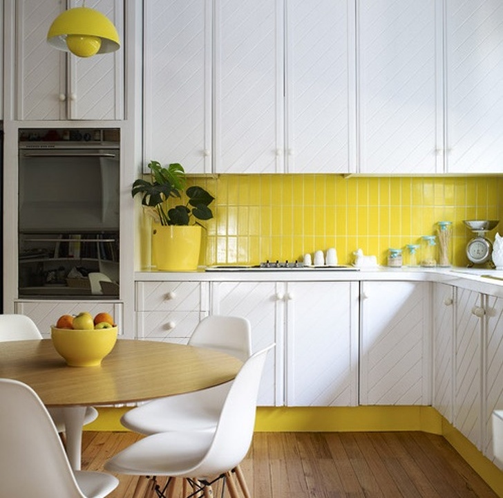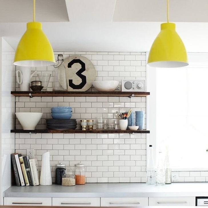 El color amarillo siempre es apropiado en la cocina: es muy jugoso y “sabroso”. Si tienes una cocina blanca, vale la pena probar la combinación de madera natural con lámparas de color amarillo saturado.