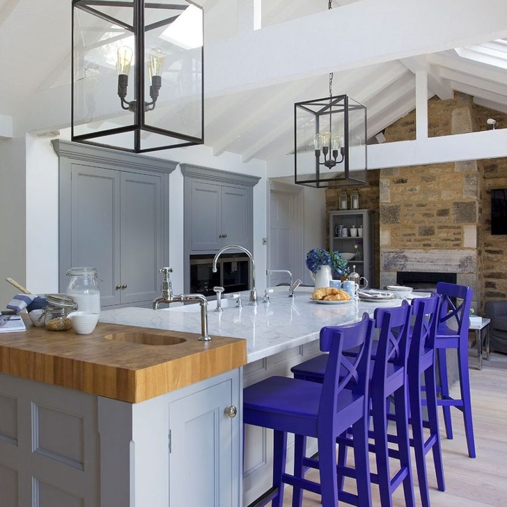 Otra forma de agregar color al interior de la cocina es elegir las sillas de un tono de lavanda intenso