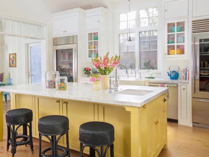 La isla de color amarillo suave hace que la cocina no solo sea cómoda, sino que también agregue luz y alegría.