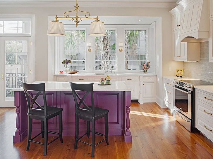 La isla elegante de una rica tonalidad ciruela es el centro de la clásica cocina blanca y, sin duda, atrae la atención.