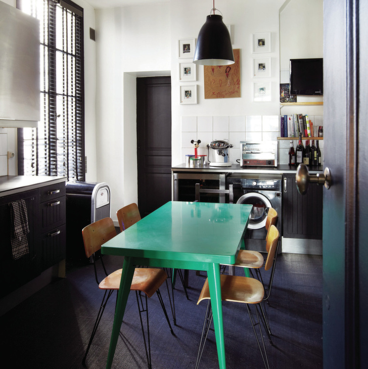 El verde brillante resalta favorablemente la cocina en los tonos oscuros de la diseñadora francesa Sarah Lavoine.