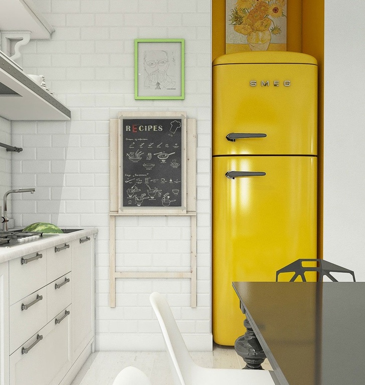 La combinación de amarillo limón y blanco es particularmente adecuada para cocinas pequeñas, ya que los tonos claros amplían visualmente el espacio y los colores intensos crean volumen.