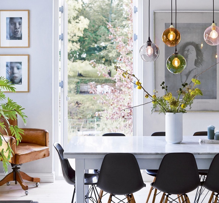 Los tonos semi transparentes de lámparas de vidrio coloreado crean un ambiente festivo en la cocina.