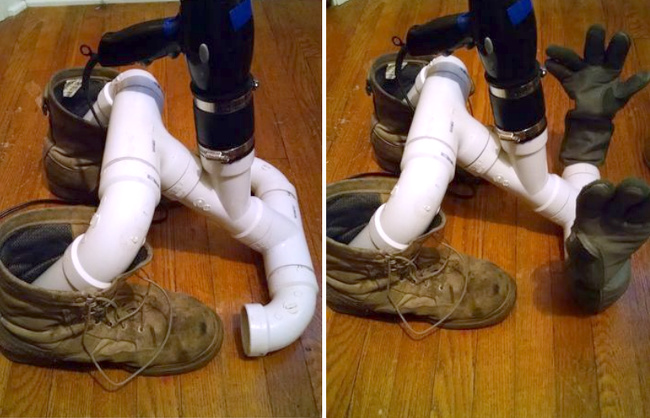 Esta invenção simples com tubos de plástico e um secador de cabelo vai te ajudar a secar os 2 sapatos ao mesmo tempo. O importante é que você coloque o secador no modo frio.