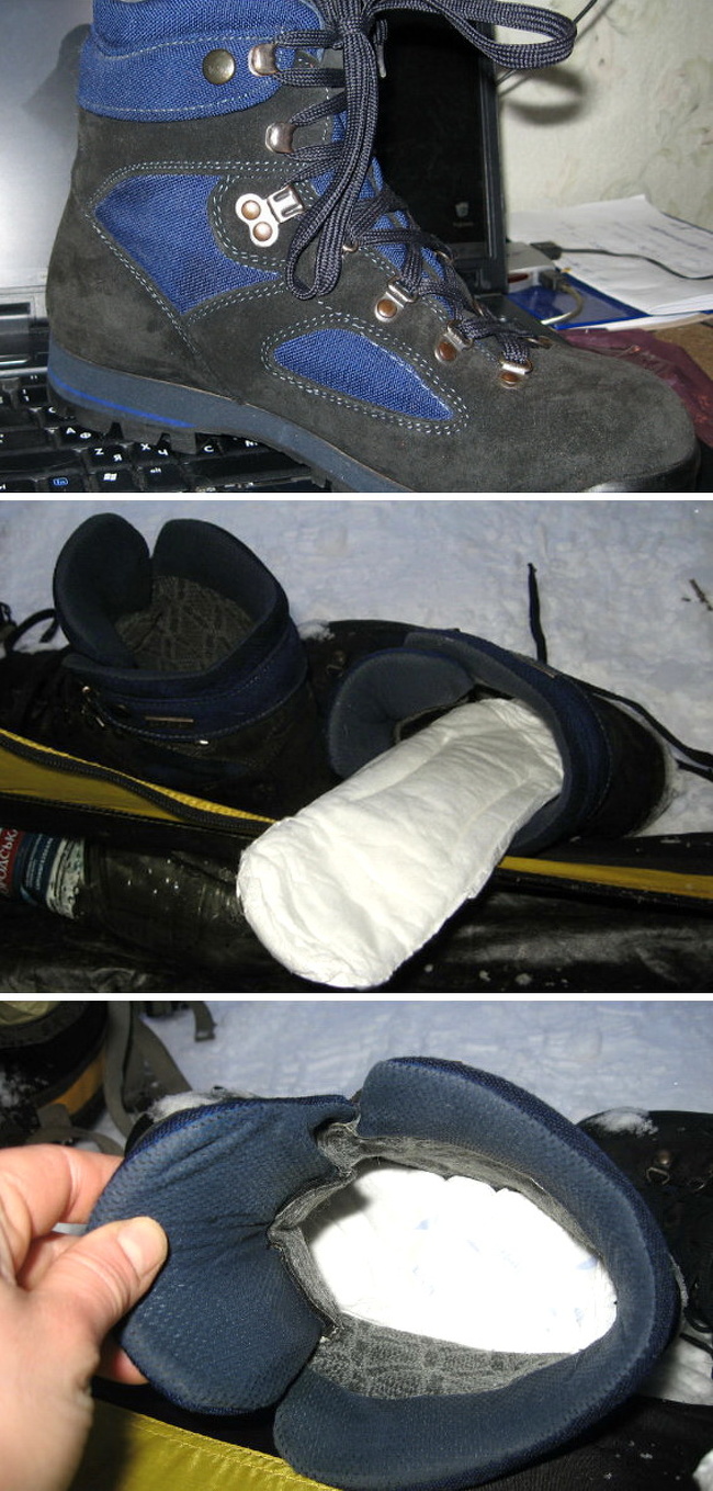 As pessoas mais experientes asseguram que colocar um absorvente higiênico no interior do calçado é um método é ideal para esquiar, fazer longas caminhadas e dar longos passeios ao ar livre. O resultado é sempre muito agradável: pés quentes e secos.