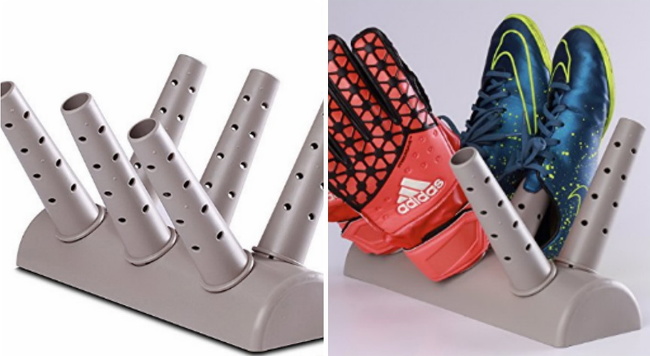 Este sistema para secar sapatos e luvas não precisa de eletricidade e pode ser levado para qualquer lugar. Basta ser colocado em um lugar ventilado que o ar seca tudo.