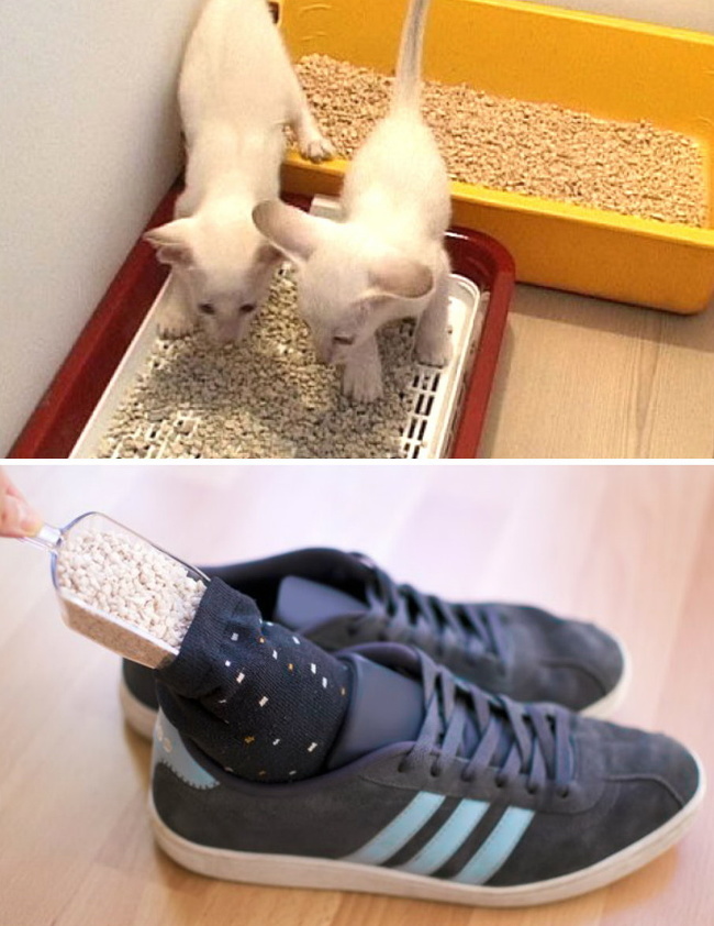 Use areia para gatos. Ela é um ótimo absorvente de umidade e neutraliza cheiros. Além disso, ela ajuda a secar rapidamente os sapatos.