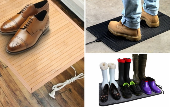 Esses tapetes podem ser feitos com bambu ou com algum tecido resistente. A película térmica dentro do tapete esquenta em 10-15 minutos a 40ºC. Eles são bons porque secam vários pares de sapatos ao mesmo tempo.