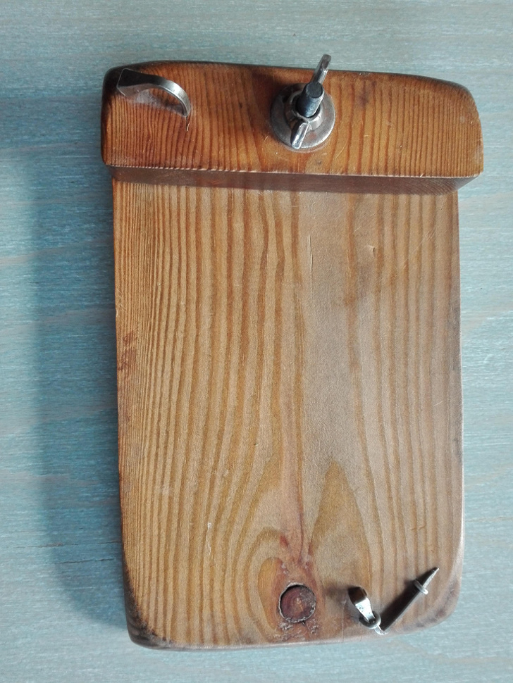 Anteriormente, las personas usaban utensilios de cocina de mano (picadoras de carne, etc.). Se colocaban en el tablero estrecho con una abrazadera de tornillo especial. Si miras de cerca, puedes ver las marcas de los tornillos.
