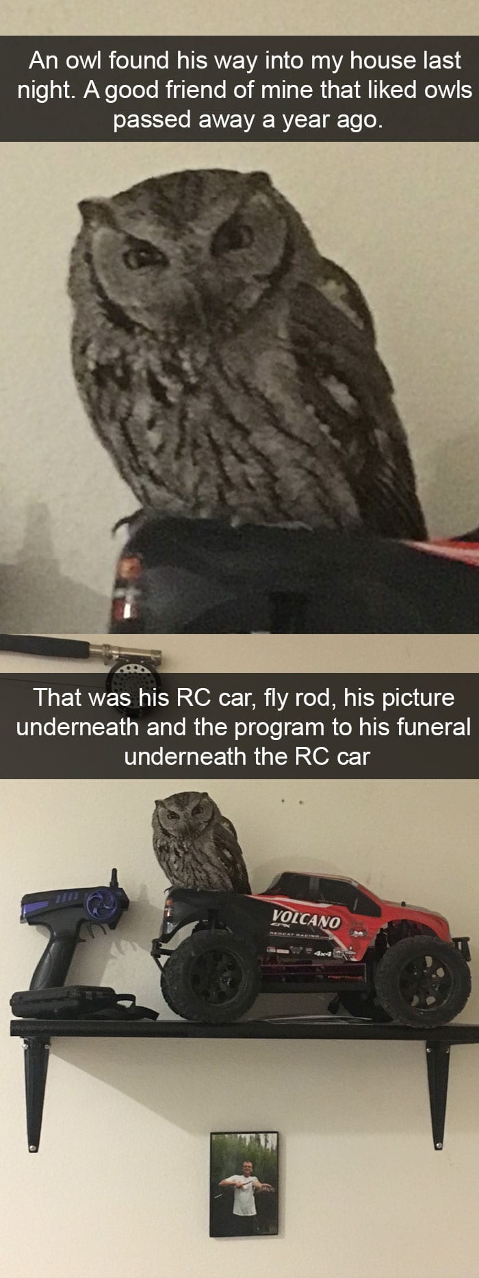 There was no logical explanation of how this owl ended up in this person’s house. The homeowner got to hang out with the owl for a few hours. He told him everything that he wished he would have told his friend before his died. The owl left when the sun came up.