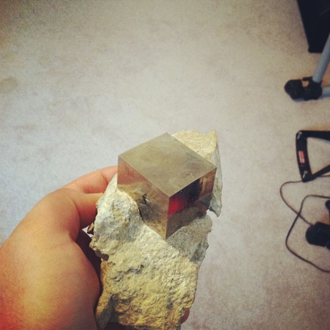 A perfect cube of pyrite in a natural rock. It’s incredible how nature creates such things!