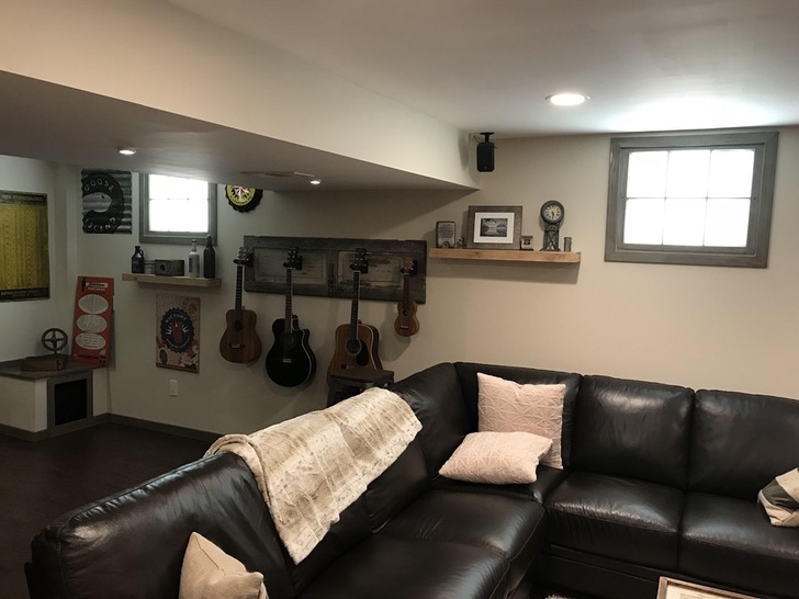 2. “I wanted natural light in a basement that has no windows. Paid $10 for 2 old windows. Painted them, frosted the glass, installed them into my wall with 12” LED flat panel lights behind them.”