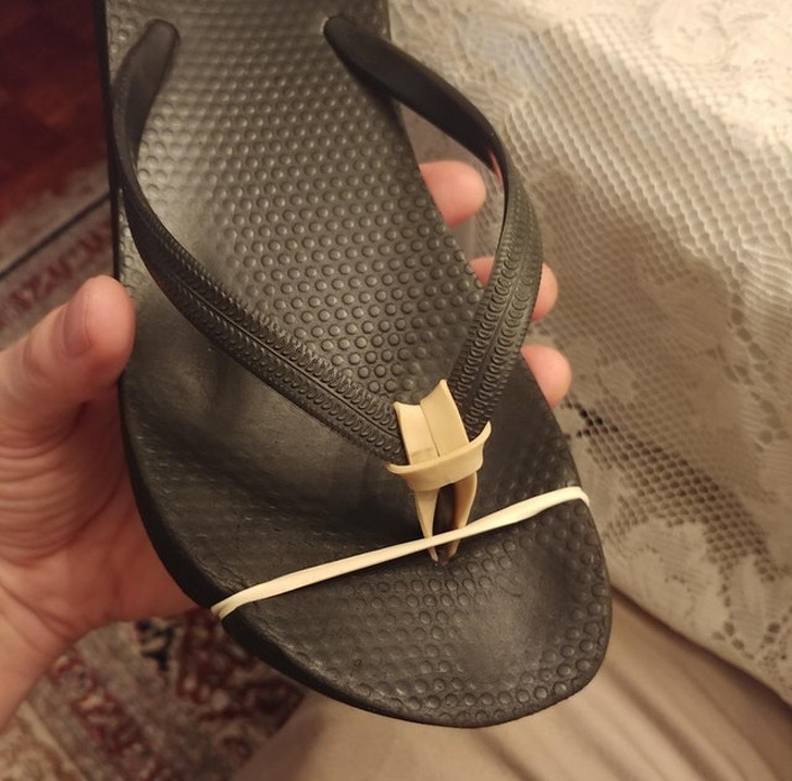 20. “Wife broke her flip-flop, so I salvaged it with a rubber band so she didn’t have to walk barefoot.”