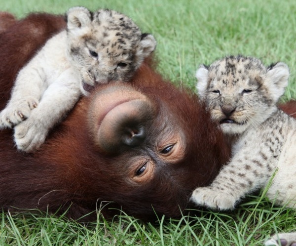 Hanama the orangutan is a happy father. He adopted several lion and tiger cubs and became their nurse until they could take care of themselves.