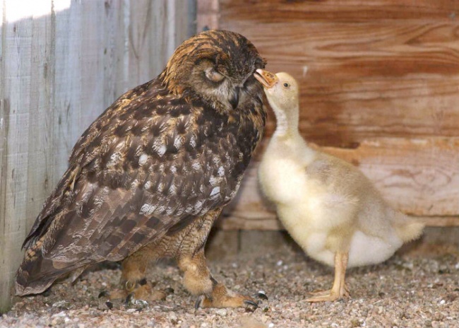 Gandolf the owl laid eggs every year and waited for offspring, but the babies never hatched. Once she was thrown an egg from which a baby goose hatched. She took care of him, even though owls usually kill baby birds that differ from them in appearance or smell.
