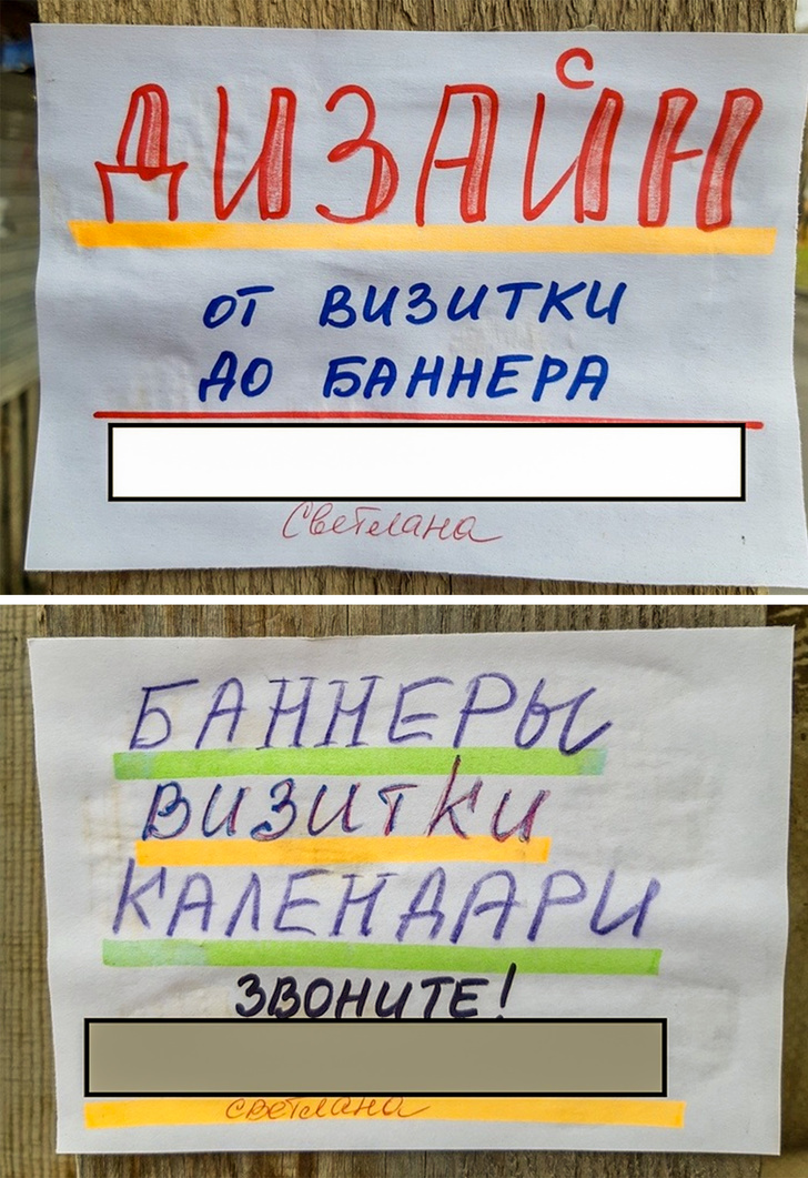“Carteles. Tarjetas de presentación. Calendarios. ¡Llame ya!”.