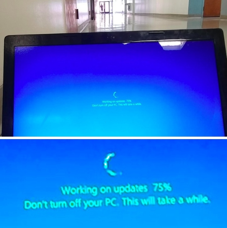 “Actualización del sistema: 75%. No apague el equipo. Puede tardar un rato”.