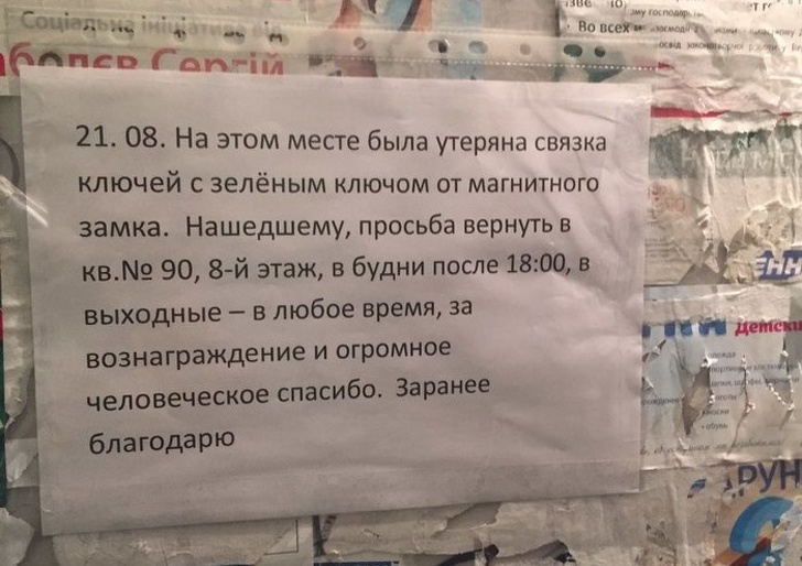 “El 21.08 en este lugar fue perdido un juego de llaves con una llave magnética verde. Pido devolverlo al departamento número 90, piso 8, después de las 18 los días de semana, o durante todo el día los fines de semana. Habrá una recompensa y un agradecimiento sincero. Gracias de antemano”.
