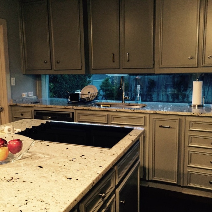 9. Una cocina con una ventana entre las alacenas y cajoneras
