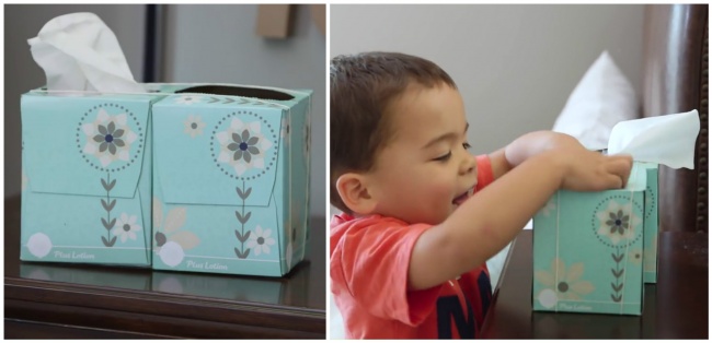 Junte duas caixas de lenços com um elástico, uma cheia e outra vazia. Isso ajuda a manter a casa em ordem se o seu filho estiver resfriado.