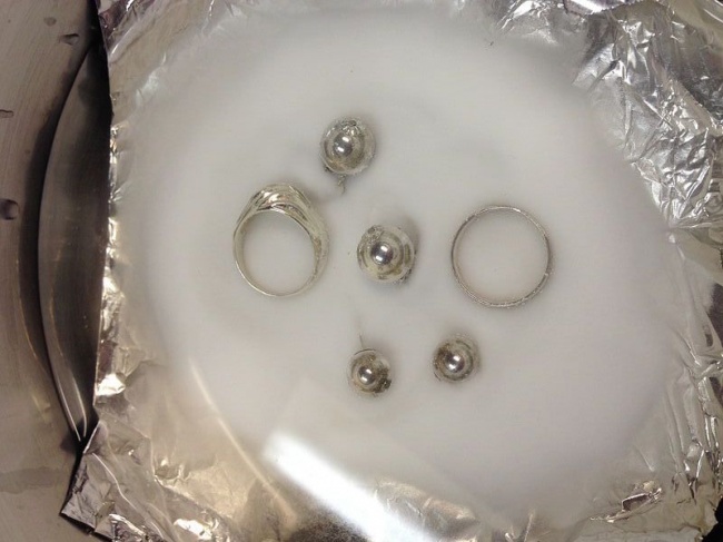 Pegue um recipiente grande e cubra o com papel alumínio. Jogue água quente, meia xícara de sal e meia xícara de bicarbonato de sódio. Submerja os artigos de prata na mistura durante 30 minutos e seque-os com um pano seco. Adeus, manchas escuras.