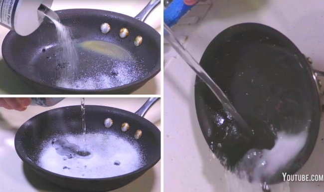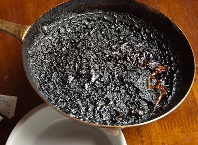 Cubra a superfície da frigideira com sal e coloque um pouco de água. Após 10 minutos ela estará limpa.