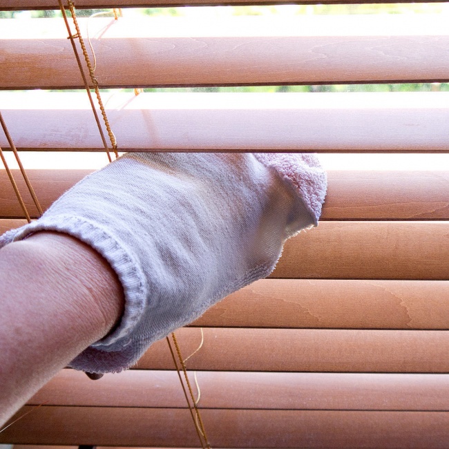 Coloque uma meia limpa em sua mão, submerja-a em uma mistura de uma parte de água por uma parte de vinagre. Passe a meia na superfície da persiana.