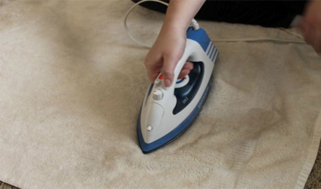 Coloque um pouco de sal sobre papel manteiga, previamente colocado sobre uma tábua de madeira. Ligue o ferro, deixe esquentar e passe sobre o sal vigorosamente durante 1 minuto.