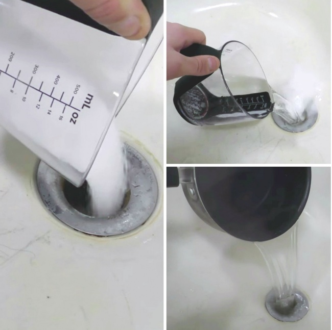 Misture bicarbonato de sódio e sal em partes iguais e coloque no cano. Em seguida, derrame um pouco de vinagre. Após 15 minutos, lave com água fervendo.