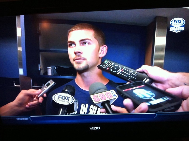 El lanzador de los Atlanta Braves, Tim Hudson, y un reportero que sostiene un control remoto durante una entrevista posterior al juego de Mike Minors