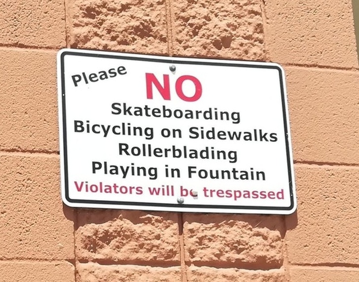 Por favor, NO monopatinaje, andar en bicicleta en la acera, patinar, jugar en la fuente.