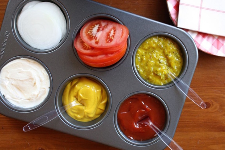 11. You can create a condiment station in a cupcake pan for your next cookout.