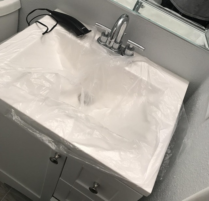 9. For those who are tired of cleaning short hairs from the sink after shaving, a piece of plastic wrap can help save time.