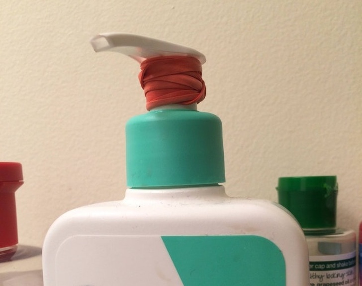 13. To prevent dispensers on bottles from leaking on trips, wrap them with rubber bands.