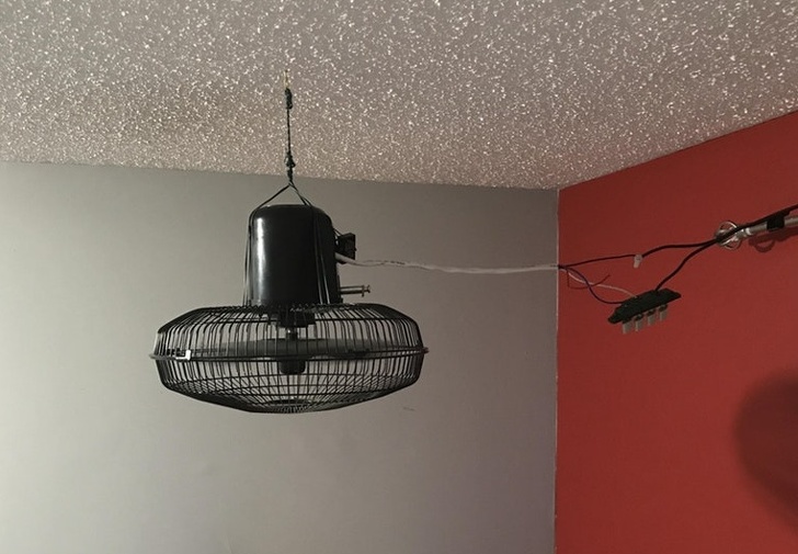 6. Want a ceiling fan? Mount your table fan to the ceiling with a string and a hook.
