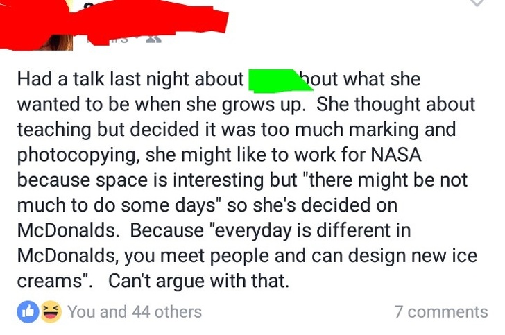 Tuve una charla anoche con … sobre lo que quiere ser cuando sea grande. Pensó en enseñar, pero decidió que era demasiado trabajo corregir y hacer muchas fotocopias. Dijo que le gustaría trabajar para la NASA porque el espacio es interesante, pero “puede que no haya mucho que hacer”, así que ella decidió que trabajará en McDonald’s, porque “cada día es diferente allí, conoces personas y puedes diseñar nuevos helados”. No pude discutir eso.