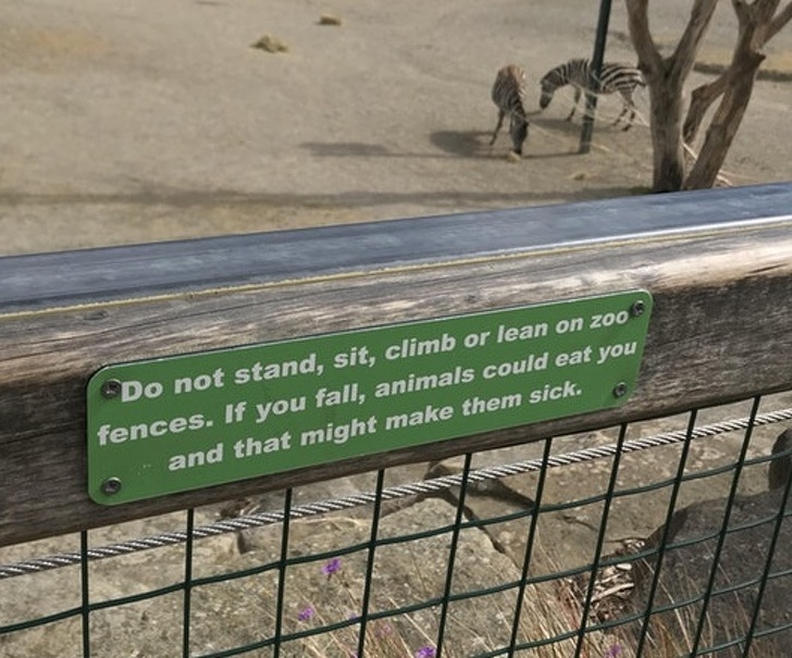 No te pares, ni te sientes, ni trepes, ni te apoyes en las vallas del zoológico. Si te caes, los animales podrían comerte y eso podría enfermarlos.