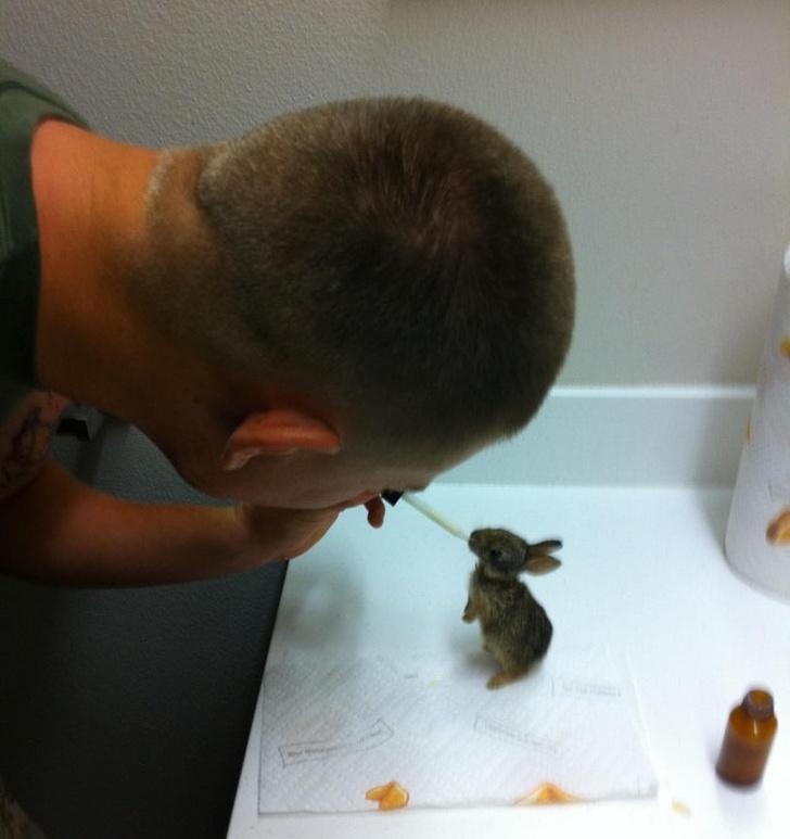 20. Un marino de Estados Unidos encontró a 4 pequeños conejos en un agujero al lado de su madre muerta, así que los alimentó con un biberón y gotero cuatro veces al día por 2 meses hasta que pudieron comer por sus propios medios